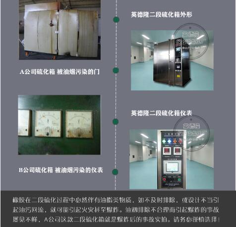 5. 设备密封条采用特种材料,解决了一直困扰国内外的一个大难题——市场上常用的密封产品及技术,只要用到二段硫化箱上很快就被腐蚀,导致大量油烟泄漏,严重影响车间环境和工作人员身心健康.我司很好的解决了这一难点.产品具有韧性好,高温环境下耐油抗腐蚀,不易变形、发粘等特点.